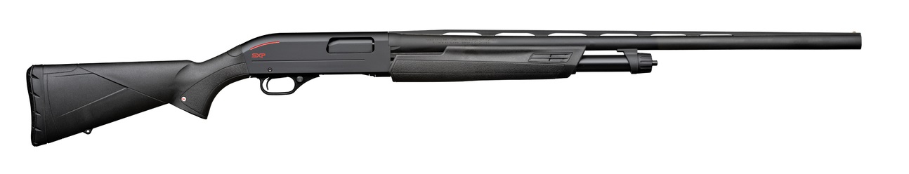 Legendaarinen Black Shadow pumppuhaulikko mattakäsittelyllä pinnalla ja synteettisellä tukilla.